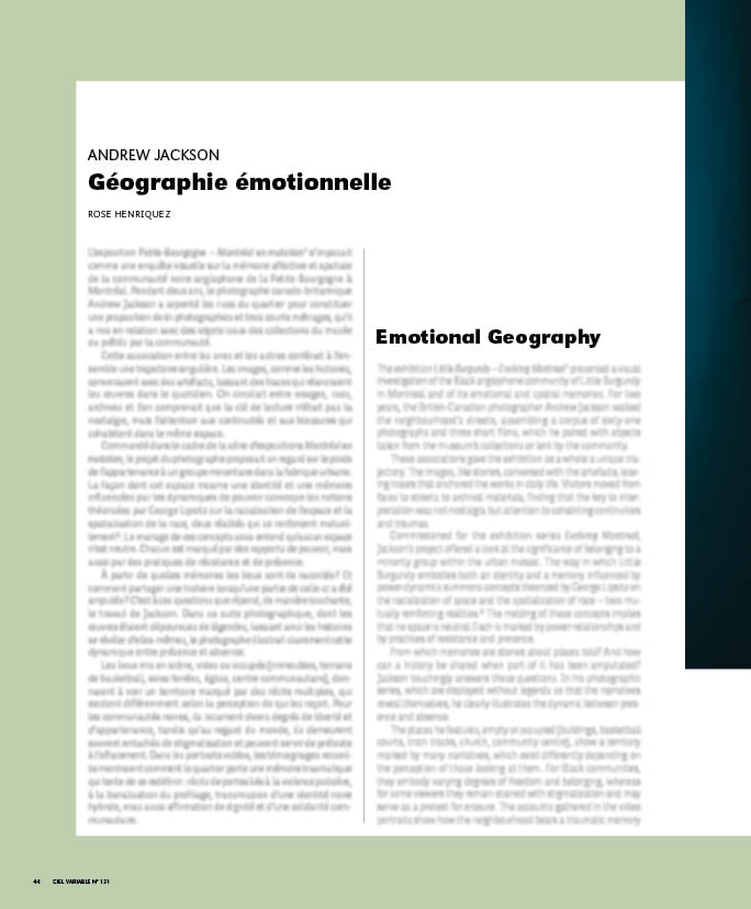 Rose Henriquez, « Andrew Jackson, Petite-Bourgogne, Géographie émotionnelle », Ciel variable, nº 131, « Collectionner », Montréal, 2026, p. 44-51